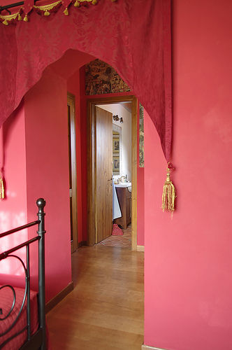 Master bedroom:- with king size antique iron bed, chestnut beams with ceiling fan and patio doors to small terrace with views of Montagna Bocco. A large en-suite bathroom with bath and shower.